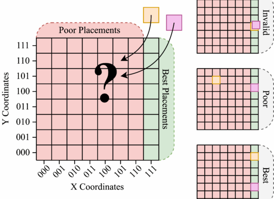The problem selected was a form of configuration-design problem. A pictorial representation can be seen below. The problem involves placing two tiles (pink and orange) within the grid. Both tiles must be on the eastern wall of the grid and occupy different spaces. A single objective as included to minimise the horizontal space covered by the tile placements. This problem was chosen as it is an abstraction of many engineering design problems such as factory layout, PCB design, and placement of environmental sensors.